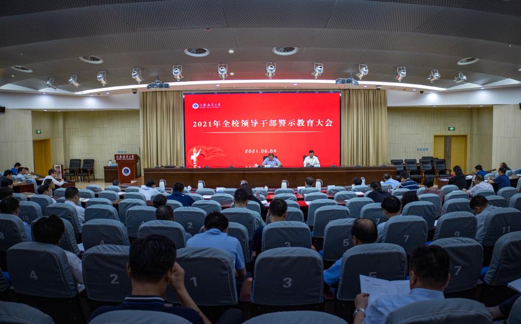 为持续推进全面从严治党向纵深发展,充分发挥典型案例的警示震慑作用,做实做细省委巡视整改“后半篇文章”,6月4日下午,我校在会议中心黄海厅召开2021年全校领导干部警示教育大会。会议由校党委副书记、校长宁晓明主持,全体校领导、中层干部参加了会议,校党委书记王自力在大会上讲话。