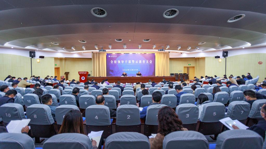为深入学习贯彻习近平总书记关于党的自我革命的战略思想,深化一体推进不敢腐、不能腐、不想腐,坚定不移把全面从严治党推向纵深,以案为鉴、以案示警、以案明纪,教育引导全校广大党员干部自重自省自警,永葆忠诚干净担当的政治本色,10月27日下午,我校在会议中心黄海厅召开2022年以年轻干部和新提任干部为重点的全校领导干部警示教育大会。会议由校长宁晓明主持,校党委书记王自力出席会议并讲话。全体校领导和中层干部参加了会议。