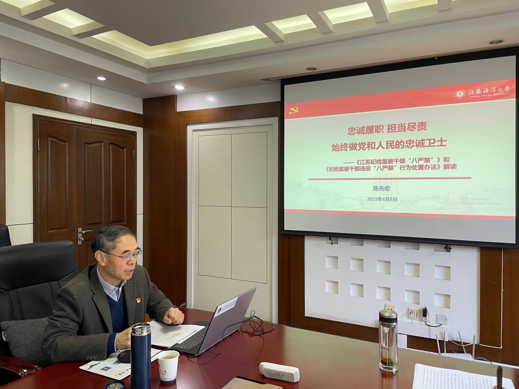 陈先宏紧紧围绕“忠诚履职担当尽责始终做党和人民的忠诚卫士”这一主题,从充分认识开展教育整顿的重大意义、详细解读《江苏纪检监察干部“八严禁”》和《纪检监察干部违反“八严禁”行为处置办法》、深刻汲取案例警示教训、锻造忠诚干净担当的纪检监察铁军四个方面,为大家作了一场主题鲜明、内容丰富、立意深刻,引人深思的廉政教育报告,对全体纪检监察干部增强廉洁自律意识,筑牢思想防线、提高拒腐防变能力,具有很强的指导意义。纪律规矩是纪检监察干部的立身之本,陈先宏要求大家将纪律规矩学深悟透,牢固树立法治意识、程序意识、证据意识,学思贯通,知行合一,全面提升监督执纪执法能力,用实干笃行来诠释纪检监察干部的担当精神。