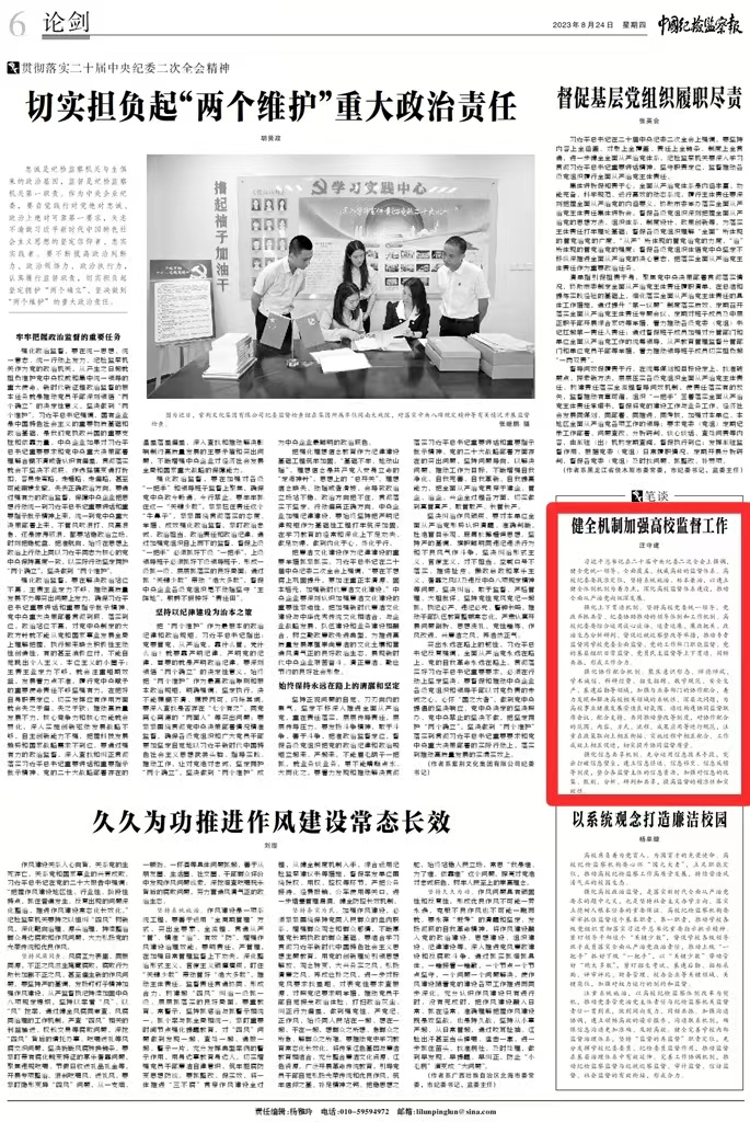 江苏海洋大学纪委副书记汪守建通过学习贯彻习近平新时代中国特色社会主义思想主题教育和纪检监察干部队伍教育整顿专题深度调研,协助学校党委建立“1+5+N”监督体系,完善9项工作机制。在此基础上撰写文章,对完善高校监督体系及工作机制提出建议,部分内容刊登在2023年8月24日《中国纪检监察报》理论周刊第6版。