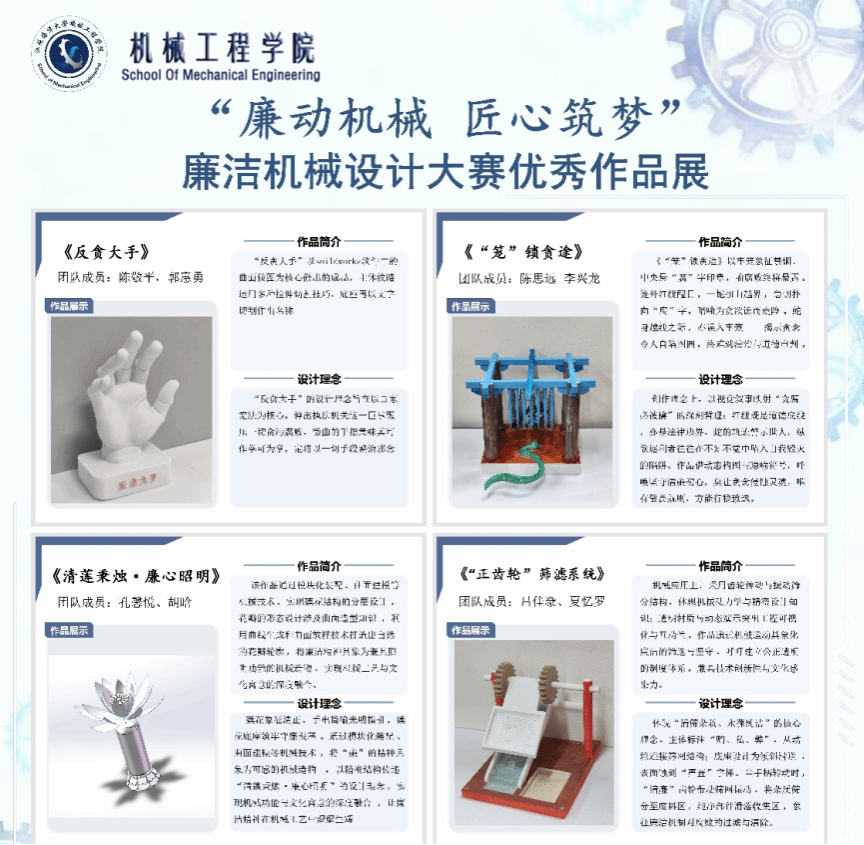 各二级党组织紧扣学科特色,将廉洁文化融入专业实践,着力打造廉洁文化建设创新项目。机械工程学院党委举办“廉动机械,匠心筑梦”廉洁机械设计大赛,巧妙运用机械结构诠释了廉洁内涵。