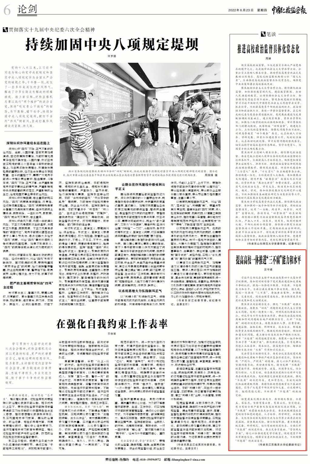 拓宽覆盖范围全面发力。要坚持无禁区、全覆盖、零容忍,坚持有案必查、有腐必惩,坚定稳妥、有力有效全面严肃查处各类违规违纪违法问题,让“不敢腐”的震慑效能充分彰显。要系统梳理高校在党的领导和党的建设、人才培养、科学研究、社会服务、文化传承创新及国际交流与合作等方面存在的制度漏洞,排查廉政风险,健全防控举措,着力构建系统完备、科学规范、运行有效的制度体系,全面扎牢“不能腐”的制度约束。要立足夯实基础、“管住绝大多数”,持之以恒推进党史学习教育,促进党员干部筑牢理想信念,增强宗旨意识和政治定力,不断增强“不想腐”的政治自觉。(江苏海洋大学纪委副书记汪守建,本文刊登于《中国纪检监察报》2022年6月23日理论周刊第6版)